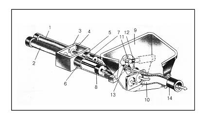 (1)(2)主油缸 (3)水箱 (4)換向裝置 (5)(6)混凝土缸 (7)(8)混凝土活塞 (9)料斗 (10)分配閥 (11)擺臂 (12)(13)擺動(dòng)油缸 (14)出料口