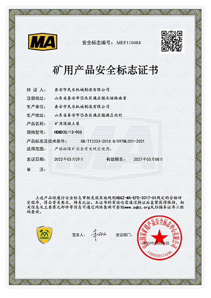 熱烈慶祝我廠礦用混凝土輸送泵通過煤安安全標(biāo)志證書(煤安編號(hào):MEF110483、MEF110484、MEF110485)。目前公司成功研制出HBMD15/6-22S混凝土輸送泵、以下簡稱“15立方混凝土泵”,且在銷售市場(chǎng)俏銷的形勢(shì)下乘勝前進(jìn),又試機(jī)成功**款新型的高壓大輸送量混凝土輸送泵HBMD30/13-90S混凝土輸送泵、HBMD80/16-110S混凝土輸送泵,目前已成功申辦“煤安標(biāo)志”,把產(chǎn)品推向市場(chǎng)。